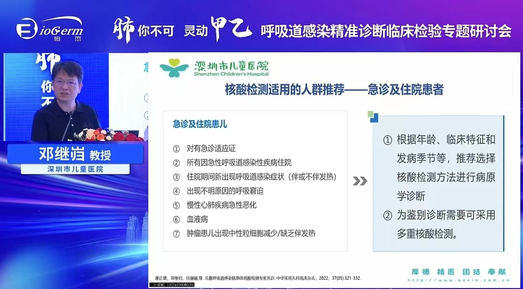 鄧?yán)^巋教授在會(huì)上做了《呼吸道病原核酸檢測共識(shí)解讀及病例分享》的報(bào)告,鄧教授提到:臨床表現(xiàn)以及影像學(xué)特征均對肺炎的診斷無特異性,需要利用核酸檢測等技術(shù)進(jìn)行病原學(xué)的特異性診斷。急性下呼吸道感染患兒、心肺等重要臟器的基礎(chǔ)疾病、心肺等重要臟器的基礎(chǔ)疾病的患者及時(shí)選用可疑病原的核酸檢測方法進(jìn)行病原學(xué)確定,盡快明確病原體,有助于患兒治療方案的確定和后續(xù)管理,對急診和住院患者根據(jù)年齡、臨床特征和發(fā)病季節(jié)等,推薦選擇核酸檢測方法進(jìn)行病原學(xué)診斷。
