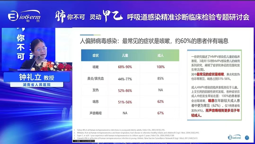 湖南省人民醫(yī)院鐘禮立教授在會(huì)上做了《不容忽視“跑偏”——人偏肺病毒的診療價(jià)值大有可觀》的專題報(bào)告提到:我國人偏肺病毒的流行病學(xué)和危害性可能低估:幾乎所有的兒童在5歲前都感染過人偏肺病毒。人偏肺病毒導(dǎo)致的危害和RSV相當(dāng):都會(huì)導(dǎo)致發(fā)熱、喘息、氣促、缺氧等,兩者流行率成正相關(guān),RSV陽性患者一旦感染HMPV,其入住ICU的風(fēng)險(xiǎn)增加10倍。免疫低下、人群尤其要注意HMPV的檢測,成人肺炎患者進(jìn)行HMPV檢測能夠有效助于抗菌管理,兒童尚有待這一類數(shù)據(jù)的產(chǎn)生。此外,確診人偏肺病毒感染后能夠有效指導(dǎo)防護(hù)隔離措施。
