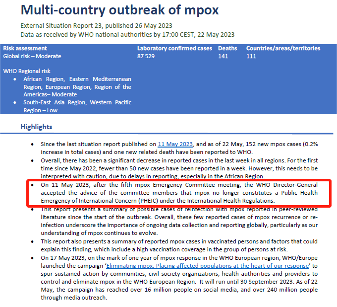 根據(jù)世衛(wèi)組織收集的數(shù)據(jù),2022年1月至2023年5月22日,全球?qū)嶒?yàn)室確診的猴痘病例共87529人,死亡病例141人,全球累積病例最多的國(guó)家為美國(guó)、巴西、西班牙、法國(guó)、哥倫比亞、墨西哥、秘魯、英國(guó)、德國(guó)和加拿大,這十個(gè)國(guó)家的病例數(shù)合計(jì)占全球病例數(shù)的84.2%。隨著全球猴痘報(bào)告病例數(shù)的逐漸減少,2023年5月11日,世衛(wèi)組織干事宣布,猴痘不再構(gòu)成PHEIC。