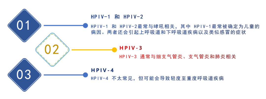 HPIV-1和HPIV-2最常與哮吼相關(guān),其中HPIV-1最常被確定為兒童的病因。兩者還會(huì)引起上呼吸道和下呼吸道疾病以及類似感冒的癥狀。HPIV-3通常與細(xì)支氣管炎、支氣管炎和肺炎相關(guān)。HPIV-4則不太常見(jiàn)2。
