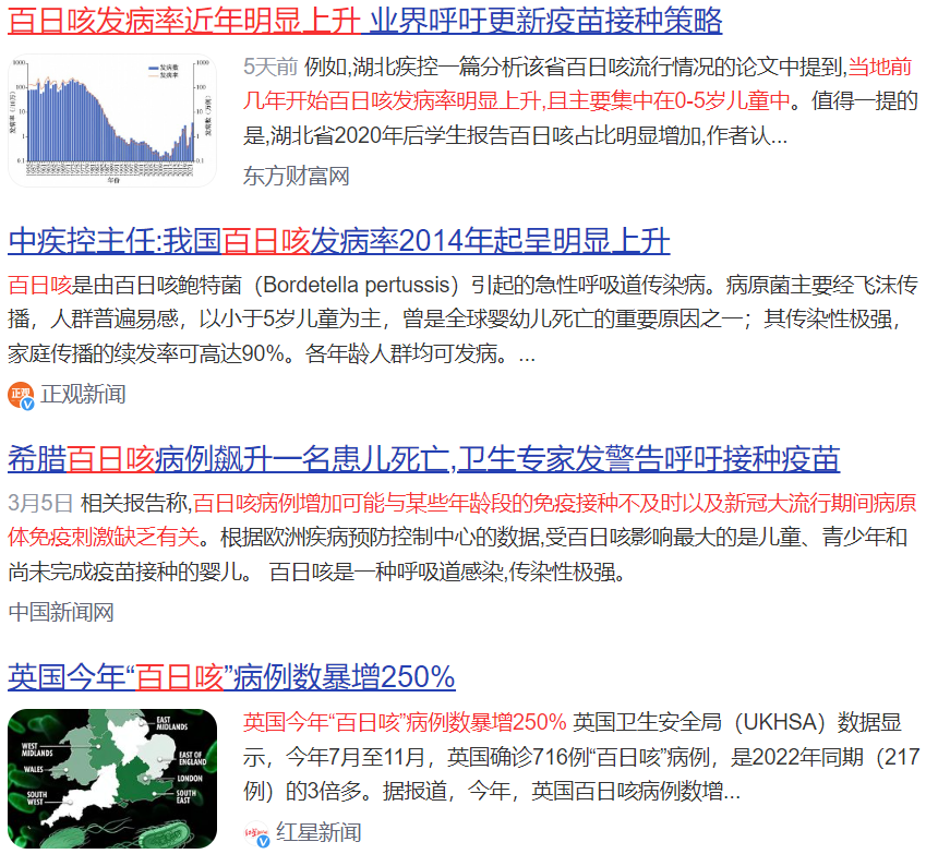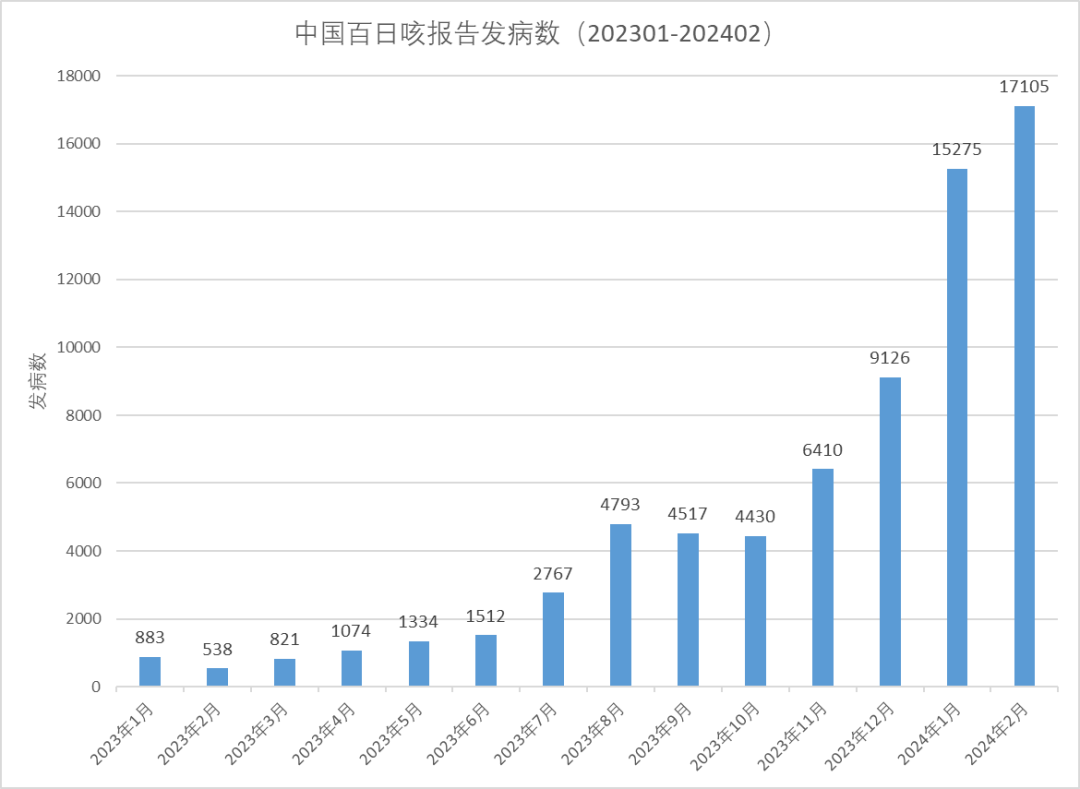 中國CDC數(shù)據(jù)也顯示,自2023年3月以來,百日咳的發(fā)病數(shù)開始上升,在2024年2月份,百日咳的發(fā)病數(shù)為17105,是2023年2月份的近32倍