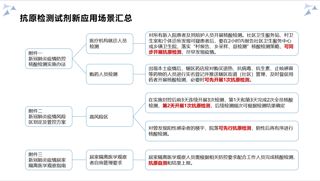 2022年11月,為全力做好新型冠狀病毒肺炎疫情防控工作,根據(jù)《新型冠狀病毒肺炎防控方案(第九版)》《關(guān)于進(jìn)一步優(yōu)化新冠肺炎疫情防控措施科學(xué)精準(zhǔn)做好防控工作的通知》有關(guān)要求,國(guó)家衛(wèi)健委發(fā)布通知公告,關(guān)于印發(fā)《新冠肺炎疫情防控核酸檢測(cè)實(shí)施辦法》等4個(gè)文件的重要通知,其中多處提及了抗原檢測(cè)的新應(yīng)用場(chǎng)景。