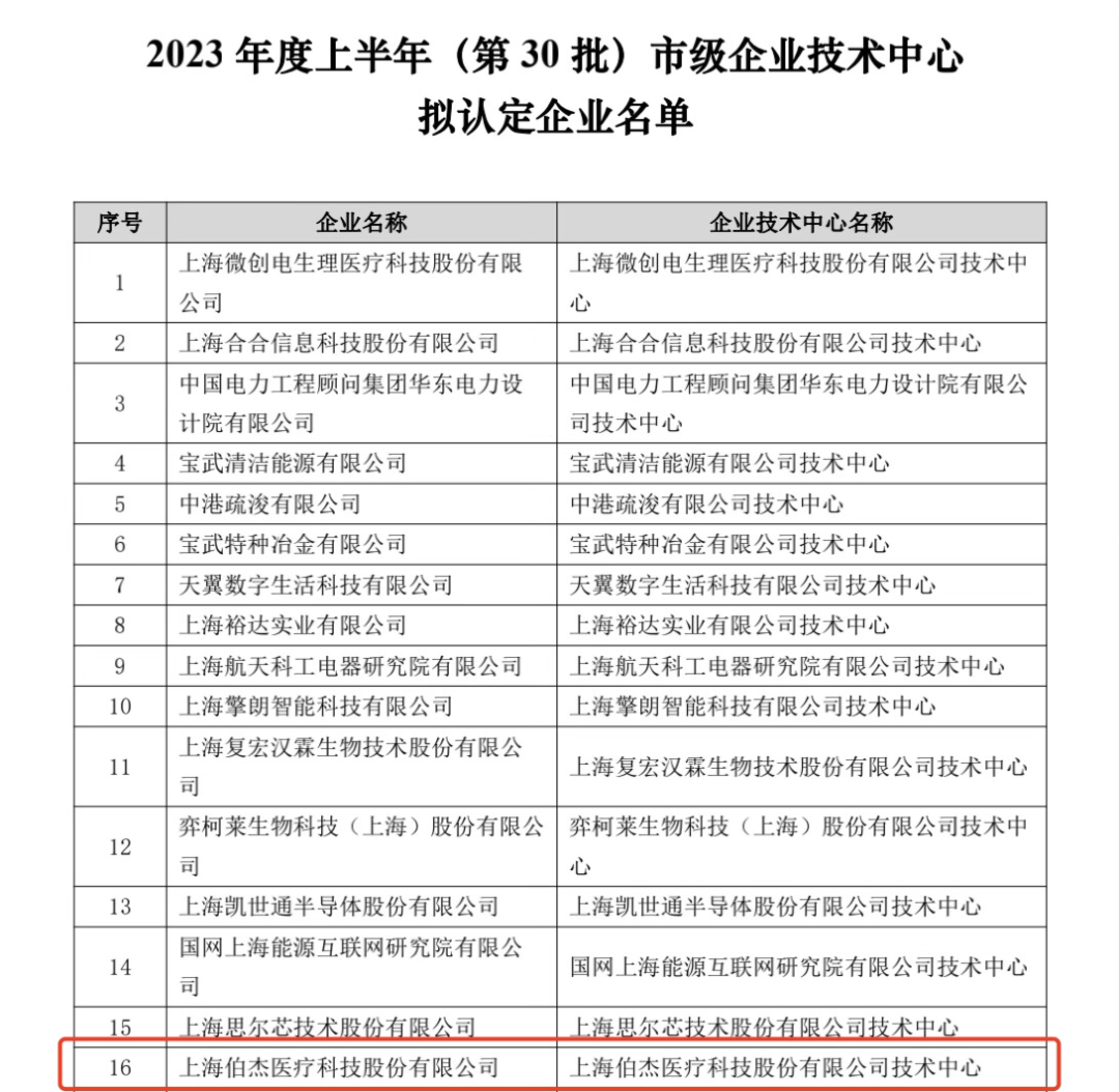 近日,上海市經(jīng)濟(jì)和信息化委員會開展了2023年度上半年(第30批)市級企業(yè)技術(shù)中心申報和評審工作。經(jīng)多層篩選,102家企業(yè)入選此次市級企業(yè)技術(shù)中心擬認(rèn)定企業(yè)名單。上海伯杰醫(yī)療科技股份有限公司(以下簡稱“伯杰醫(yī)療”)獲評“市級企業(yè)技術(shù)中心”認(rèn)定,評定為“上海伯杰醫(yī)療科技股份有限公司技術(shù)中心”,為奉賢區(qū)6家優(yōu)質(zhì)上榜企業(yè)之一。