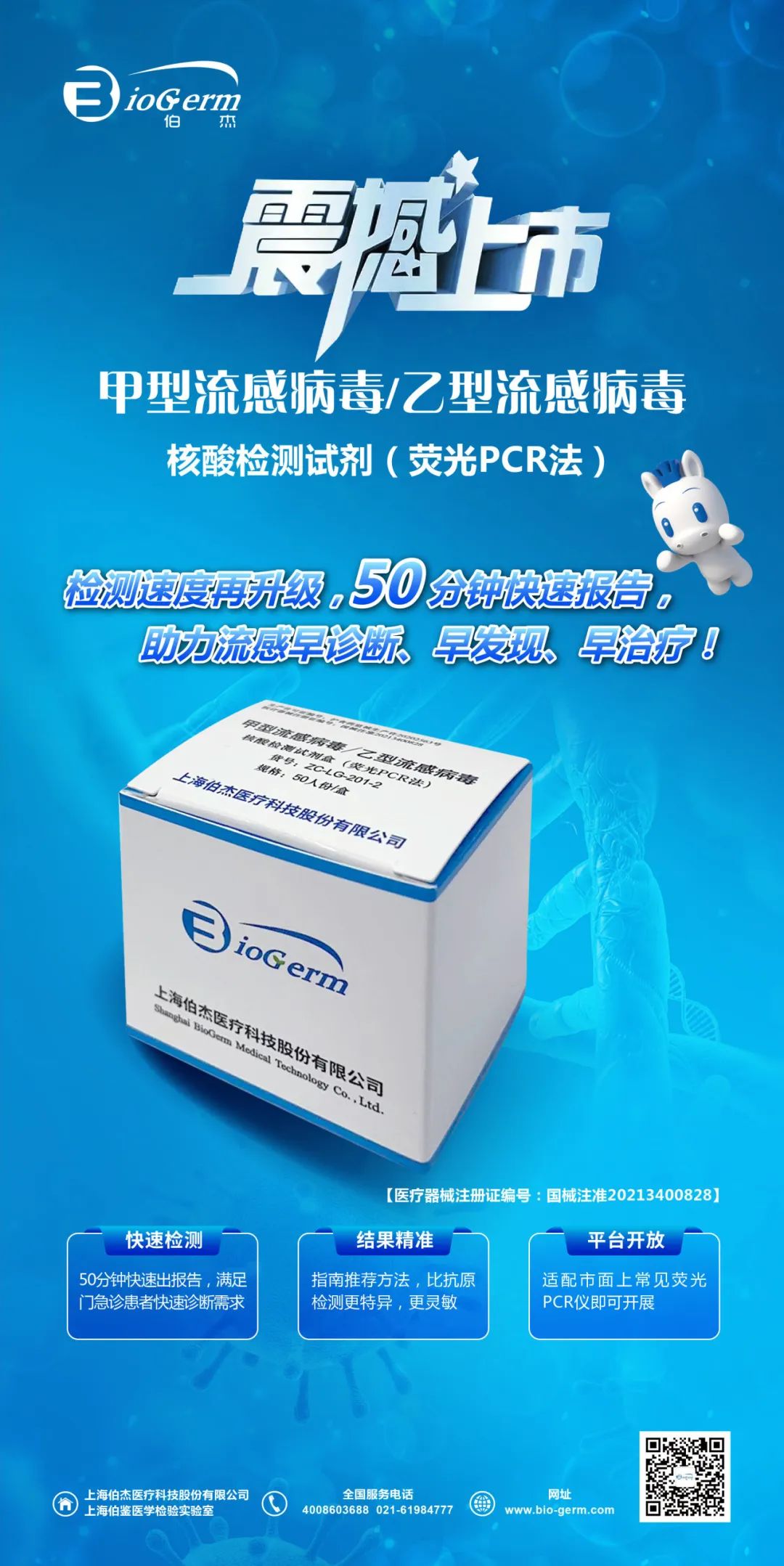 近日,此次伯杰獲批上市的甲型流感病毒/乙型流感病毒核酸檢測(cè)試劑(熒光PCR法)通過(guò)國(guó)家藥品監(jiān)督管理局審核,獲批上市。該試劑檢測(cè)速度快,50分鐘快速報(bào)告,更好的滿足門(mén)急診患者和住院患者快速診斷需求,助力流感早診斷、早發(fā)現(xiàn)、早治療!流感核酸檢測(cè)結(jié)果精準(zhǔn),是指南推薦方法,比抗原檢測(cè)更特異,更靈敏。此項(xiàng)目平臺(tái)開(kāi)放,適配市面上常見(jiàn)熒光PCR儀即可開(kāi)展。