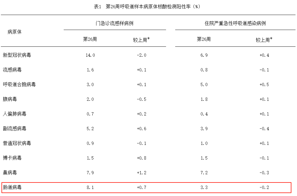 根據(jù)中國(guó)疾病預(yù)防控制中心2025年第26周(6月23日—6月29日)全國(guó)哨點(diǎn)醫(yī)院監(jiān)測(cè)數(shù)據(jù)顯示[1],流感樣病例(Influenza-like Illness, ILI)占門急診就診總數(shù)的比例為3.8%,總體處于季節(jié)性較低水平。當(dāng)周門急診流感樣病例呼吸道樣本檢測(cè)顯示,新型冠狀病毒檢測(cè)陽(yáng)性率為14.0%,腸道病毒(Enterovirus EV)檢測(cè)陽(yáng)性率為8.1%,二者位居陽(yáng)性率前兩位。值得注意的是,腸道病毒門急診陽(yáng)性率較第25周上升0.7%,其活躍度呈上升趨勢(shì),需引起重點(diǎn)關(guān)注。鑒于當(dāng)前正值腸道病毒感染夏季高發(fā)季節(jié),建議特別加強(qiáng)兒童等易感人群的健康防護(hù)與監(jiān)測(cè)預(yù)警。