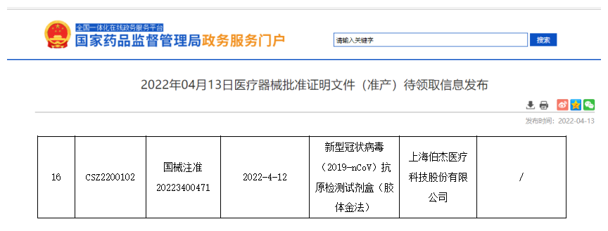 4月13日,由伯杰醫(yī)療自主研發(fā)的新型冠狀病毒2019-nCoV抗原檢測(cè)試劑盒(膠體金法)【醫(yī)療器械注冊(cè)證編號(hào):國械注準(zhǔn)20223400471】獲得國家藥監(jiān)局審批,正式上市。