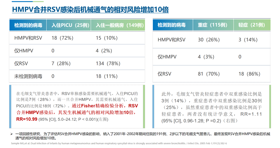 一項(xiàng)納入191例2歲以下住院患者的研究顯示:hMPV與RSV合并感染后,機(jī)械通氣的相對風(fēng)險(xiǎn)增加10倍[2]。
