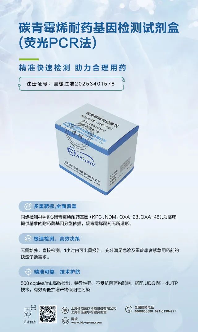 上海伯杰醫(yī)療新推出的碳青霉烯耐藥基因檢測試劑盒,以 500copies/mL 的高靈敏度,可快速識別 KPC、NDM、OXA-23、OXA-48耐藥,通過內(nèi)源性內(nèi)標設計有效規(guī)避假陰性,精準捕獲更低濃度的耐藥基因,為早期感染識別奠定基礎,顯著提升診斷的準確性與可靠性。該技術實現(xiàn)無需培養(yǎng),直接檢測,1小時內(nèi)可出具報告,充分滿足急診及重癥患者緊急用藥前的快速診斷需求。讓患者在黃金救治期避免盲目用藥,并及時觸發(fā)隔離防控措施,提升救治成功率,減少醫(yī)療資源浪費,為公共衛(wèi)生防控提供數(shù)據(jù)支撐。