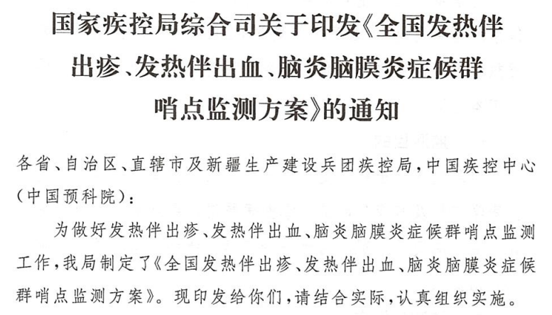 圖片來源于《全國發(fā)熱伴出疹、發(fā)熱伴出血、腦炎腦膜炎癥候群哨點監(jiān)測方案》