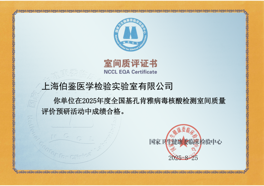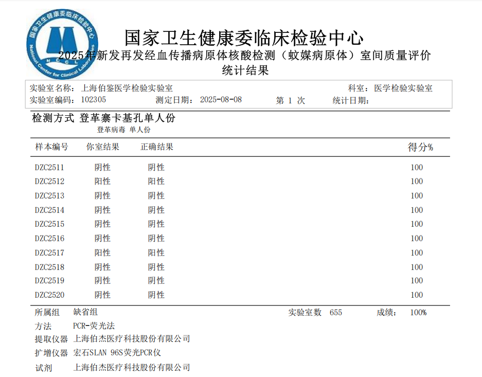 近日,國(guó)家衛(wèi)生健康委臨床檢驗(yàn)中心(NCCL)正式公布“2025年度全國(guó)基孔肯雅病毒核酸檢測(cè)室間質(zhì)量評(píng)價(jià)預(yù)研活動(dòng)”和“2025年新發(fā)再發(fā)經(jīng)血傳播病原體核酸檢測(cè)(蚊媒病原體)室間質(zhì)量評(píng)價(jià)”結(jié)果,上海伯鑒醫(yī)學(xué)檢驗(yàn)實(shí)驗(yàn)室憑借嚴(yán)謹(jǐn)?shù)馁|(zhì)量管理體系和精準(zhǔn)的檢測(cè)能力,以?xún)?yōu)異成績(jī)通過(guò)本次評(píng)估,充分彰顯了其在感染性疾病分子診斷領(lǐng)域的專(zhuān)業(yè)實(shí)力。