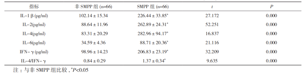 另有研究,重癥肺炎支原體組(SMPP)與非重癥肺炎支原體組(非SMPP)炎癥細(xì)胞因子水平比較發(fā)現(xiàn),SMPP組患兒急性期BALF中IL-1β、IL-2、IL-4、IL-6、IFN-γ、IL-4/IFN-γ 均顯著高于非SMPP組 , 差異具有統(tǒng)計(jì)學(xué)意義 (P<0.05)。(表1)