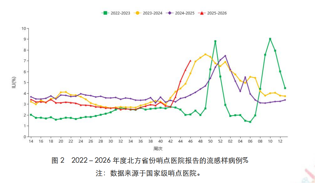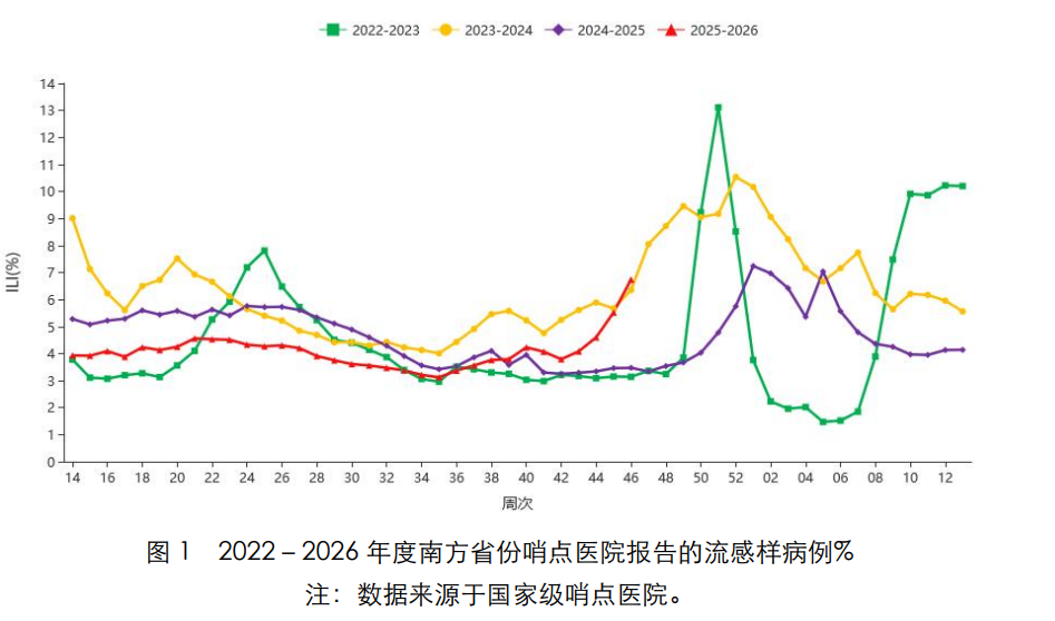根據(jù)中國(guó)疾控中心最新發(fā)布流感監(jiān)測(cè)周報(bào)數(shù)據(jù),2025 年第 46 周(2025 年 11 月 10 日-2025 年 11 月 16 日),南北方省份哨點(diǎn)醫(yī)院報(bào)告的ILI%繼續(xù)上升,均高于過(guò)去3年同期水平。