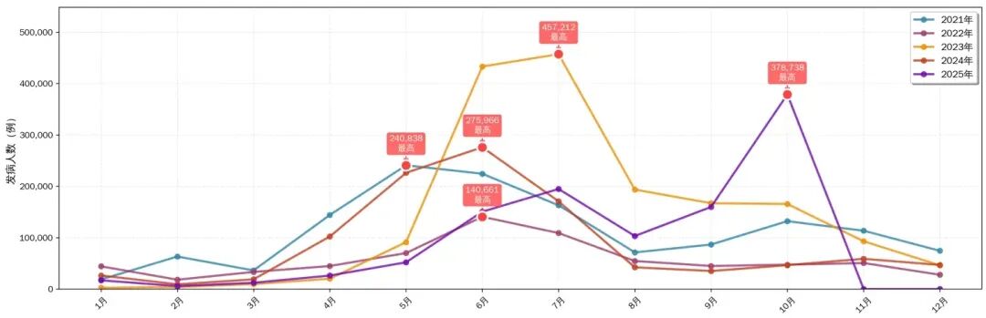 2021年-2025年手足口病月度報(bào)告病例數(shù)。數(shù)據(jù)來(lái)源:中國(guó)疾控中心