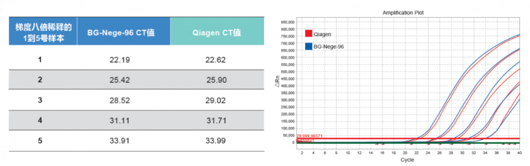 將原始樣本稀釋成CT22左右,8倍梯度稀釋,稀釋四個(gè)梯度。分別用BG-Nege-96核酸提取儀和QIAamp Viral RNA Mini Kit提取,qPCR檢測(cè),復(fù)孔后對(duì)CT值進(jìn)行比對(duì)。BG-Nege-96核酸提取儀的提取純度與金標(biāo)準(zhǔn)等效甚至更優(yōu)。