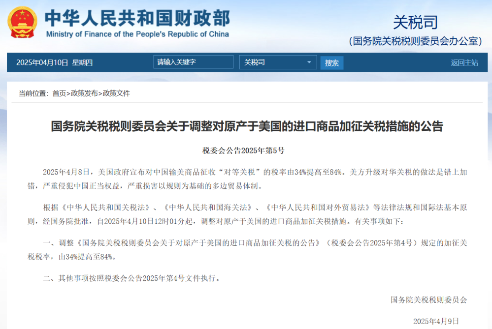 國務(wù)院關(guān)稅稅則委員會9日發(fā)布公告,經(jīng)國務(wù)院批準(zhǔn),自2025年4月10日12時01分起,調(diào)整《國務(wù)院關(guān)稅稅則委員會關(guān)于對原產(chǎn)于美國的進(jìn)口商品加征關(guān)稅的公告》(稅委會公告2025年第4號)規(guī)定的加征關(guān)稅稅率,由34%提高至84%。