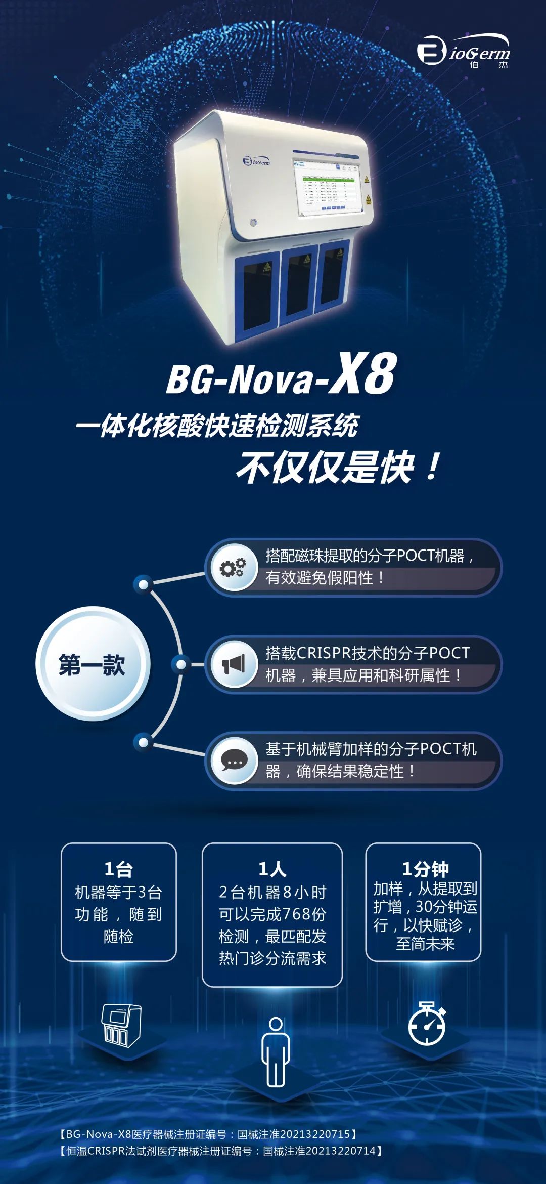 由伯杰醫(yī)療自主研發(fā)的“BG-Nova-X8一體化核酸快速檢測系統(tǒng)”一經(jīng)獲批(注冊證編號:國械注準20213220715),便引起了分子診斷市場的廣泛關注,這款定位為POCT應用場景,卻又集成CRISPR技術、磁珠提取、高精度機械臂等先進技術的設備,是發(fā)熱門診建設、急診分流的不二之選!