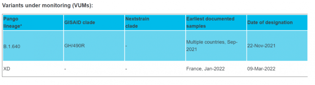 在GISAID中總共確定了68個(gè)XD樣本,其中66個(gè)來自法國,荷蘭和比利時(shí)各有一名(統(tǒng)計(jì)截止2022.04.01)。迄今為止英國還沒有檢測到XD變體。簡單來說,XD是Omicron S基因整合到Delta基因組中,主要存在于法國。雖然XD目前病例數(shù)不多,但是在2022.03.09號被歸類為VUM(圖3),也就是說世衛(wèi)組織對其變異特征和公共衛(wèi)生風(fēng)險(xiǎn)的要進(jìn)行比較評估、監(jiān)控和跟蹤。